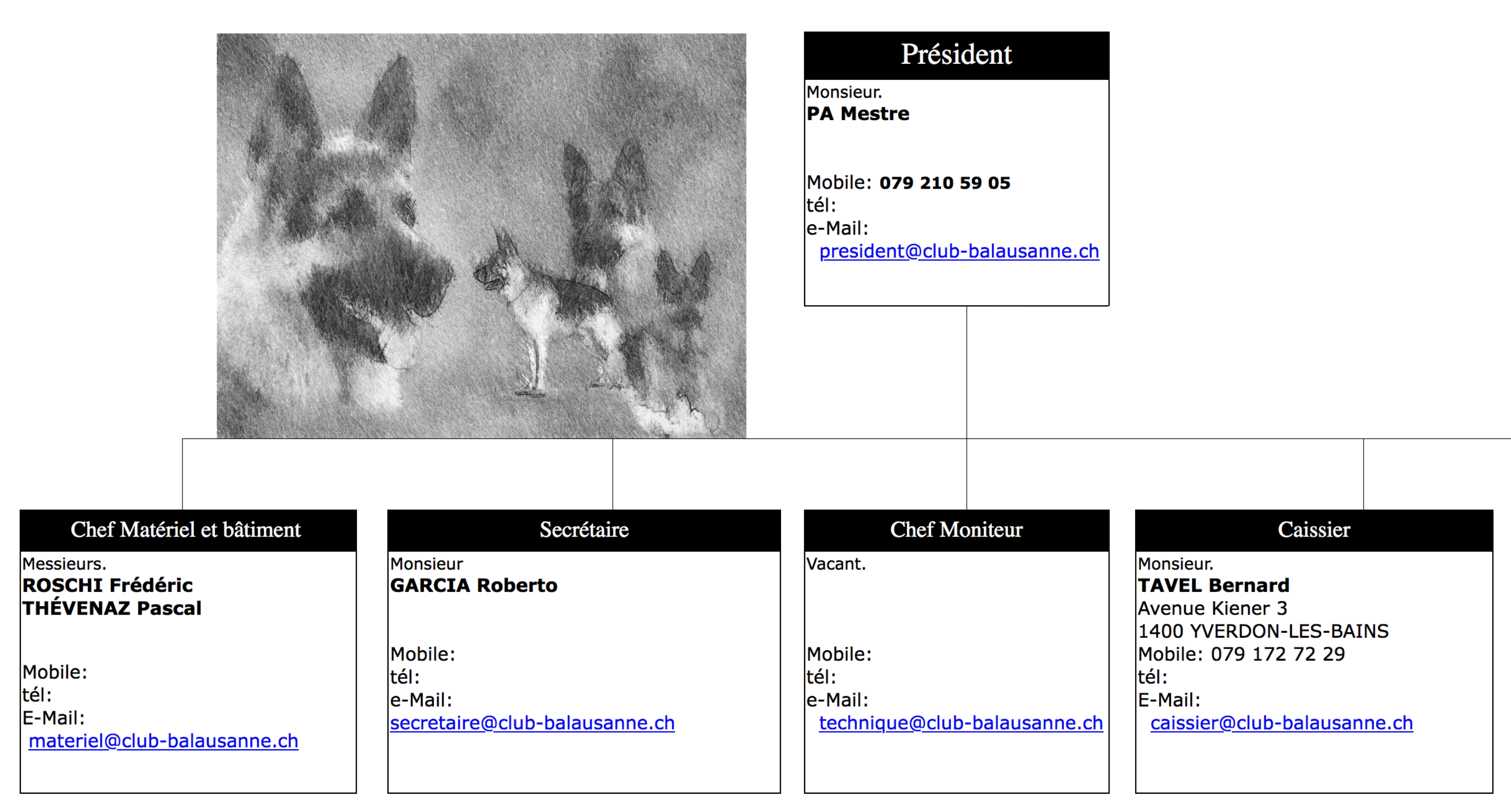 Le comité est composé d'un président, de deux chefs matériel et bâtiment, d'un secrétaire, d'un chef moniteur et d'un caissier.